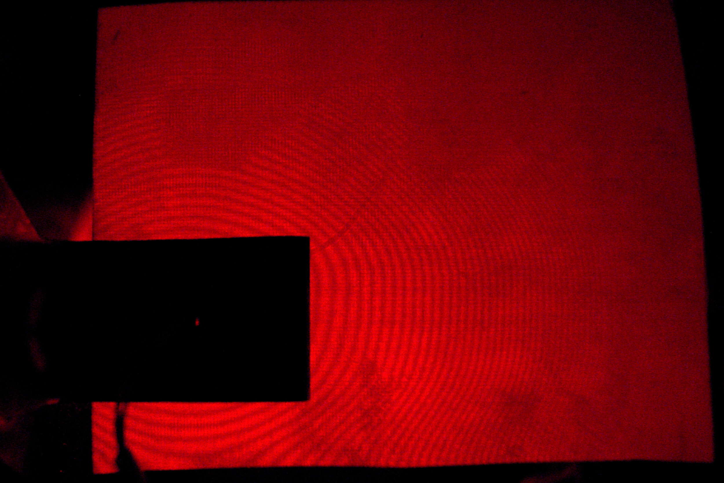 2) Включите лазер. Позади лазера поставьте экран (лучше немного просвечивающий, чтобы смотреть с задней стороны лазера). С места съёмки (сантиметров 30 от лазера) ставьте пластинку и зайчик отражайте в сторону лазера. Смотрите интерференцию (кольца) на экране.