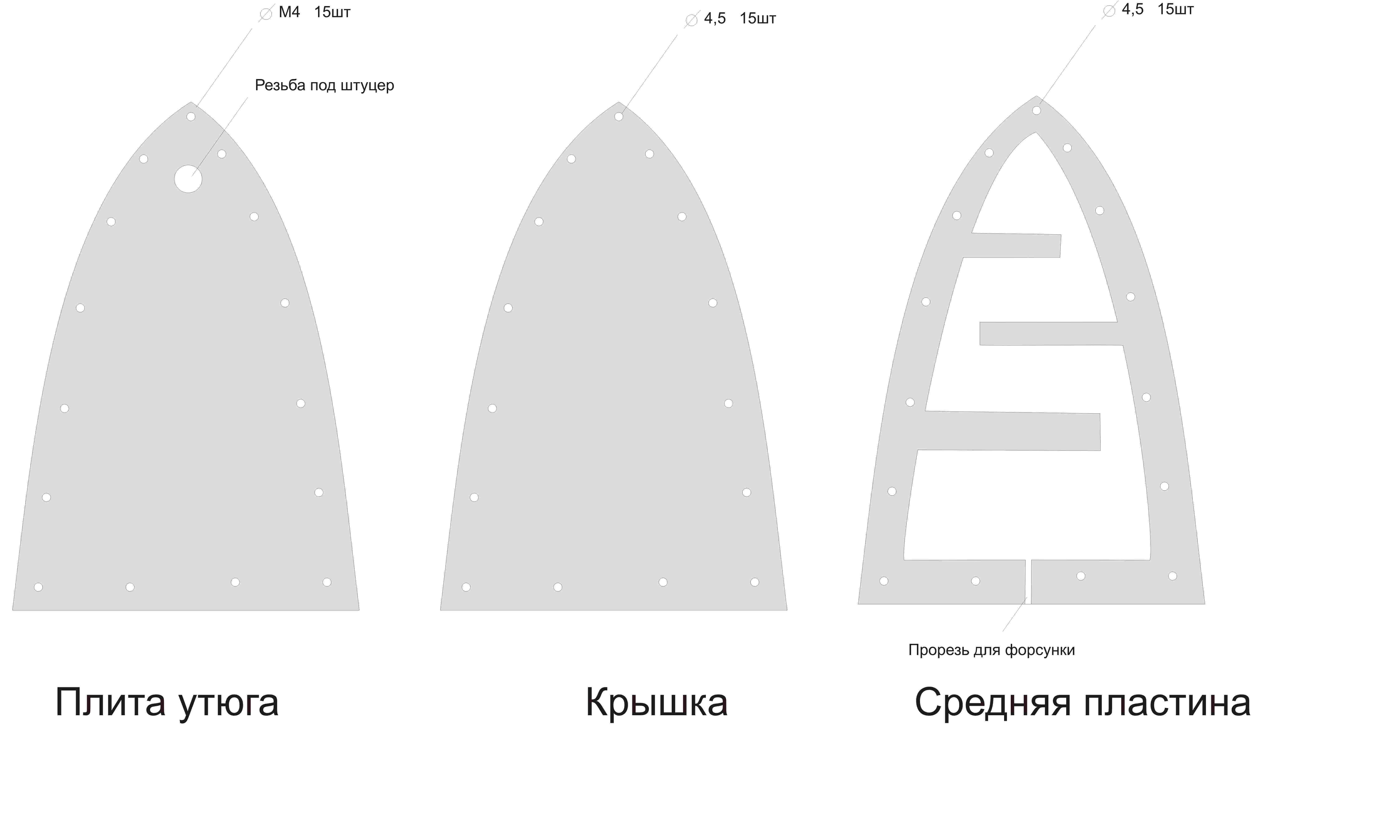 Вот такой нагреватель. В средней пластине вырезан проход для жидкости змейкой. Верхняя пластина крышка. В плите утюга сквозное отверстие с резьбой для обратного клапана и резьбовые отверстия по краю для стягивающих винтов.