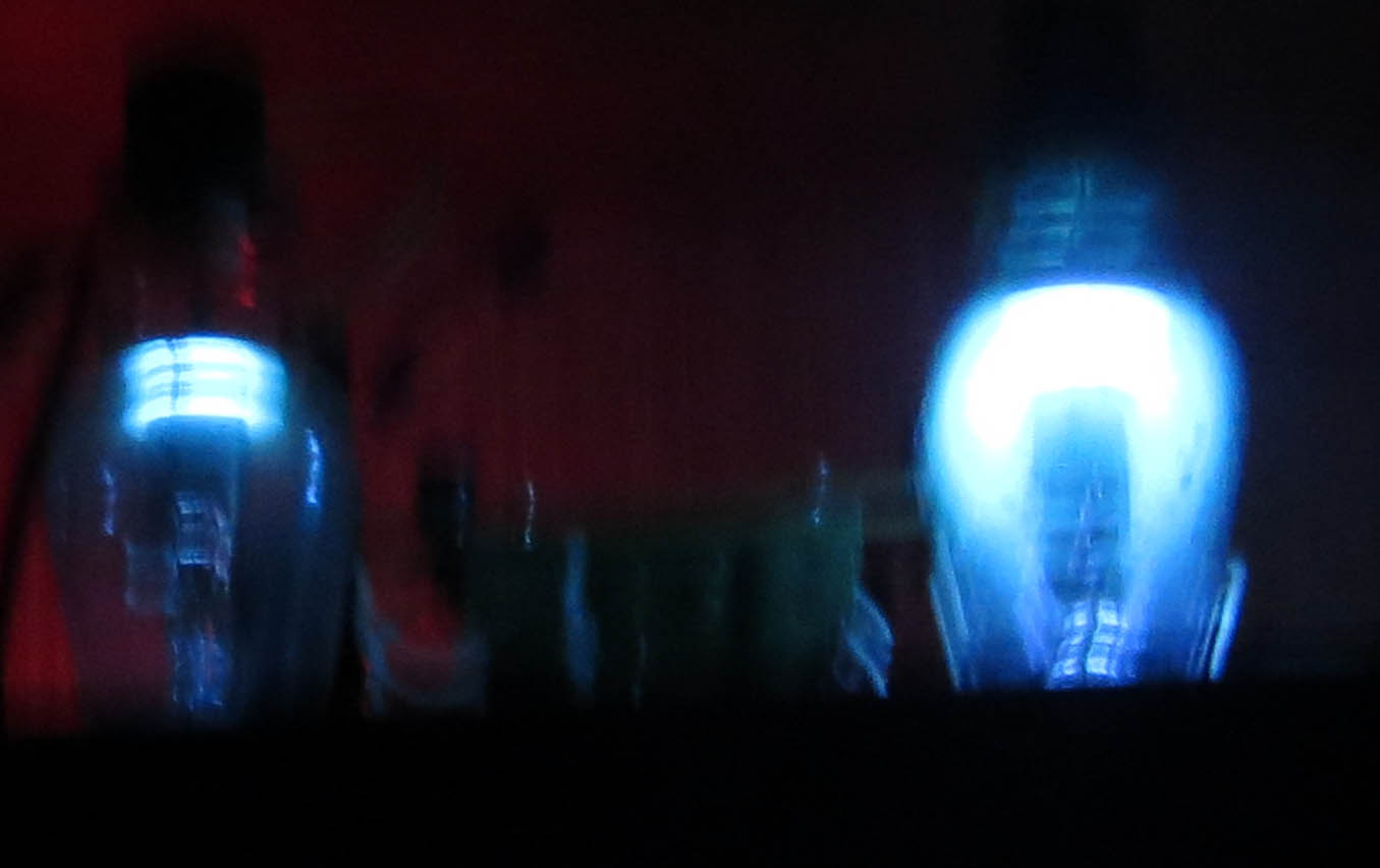 Вот 866А. Видно, когда газотрон не работает, а когда работает. Видно, что светятся приборы по разному. Что не удивительно: левый с наработкой менее 200 час., правый с неизвестной, но более 700 час. Падение напряжения на приборах подтверждает наработку: на левом ок. 10 В, на правом св. 14 В.