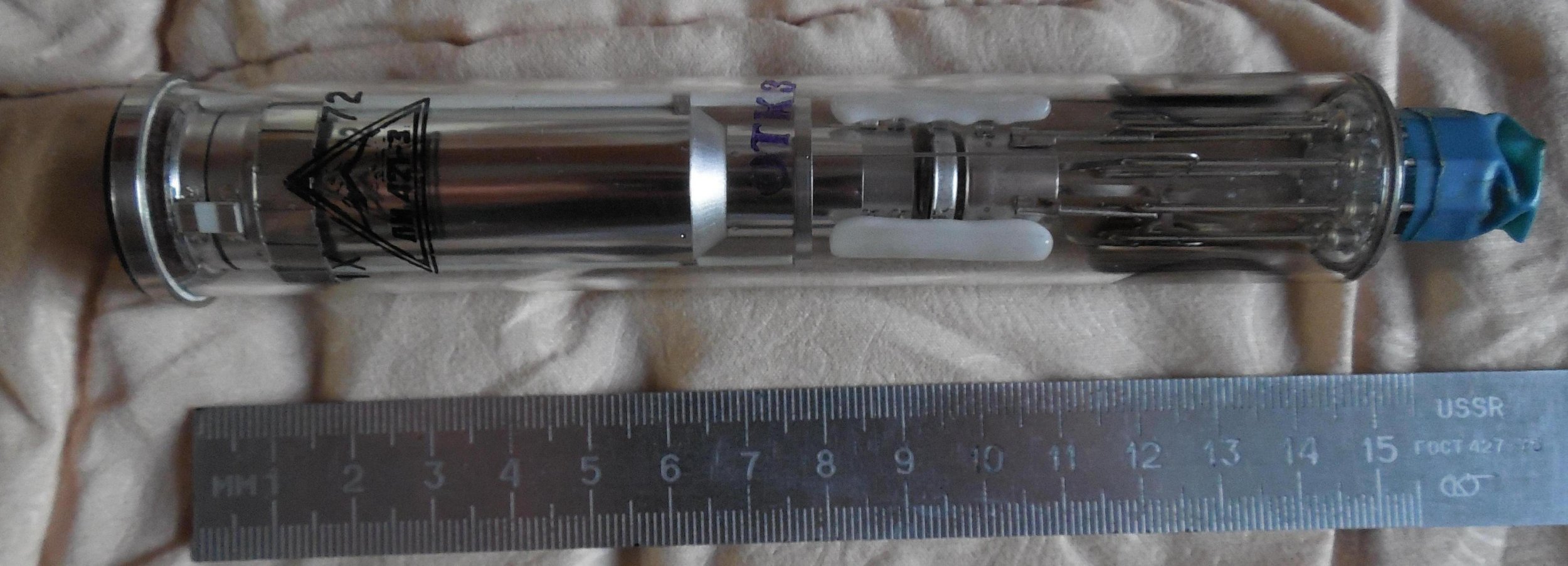 IMG_0005.JPG: Штампом военной приёмки в довоенные годы и до первых послевоенных была та или иная буква в той или иной геометрической фигуре. На снимке, опричь левой, все лампы отмечены так. На левой же более поздний штамп. Наследник в некотором роде.