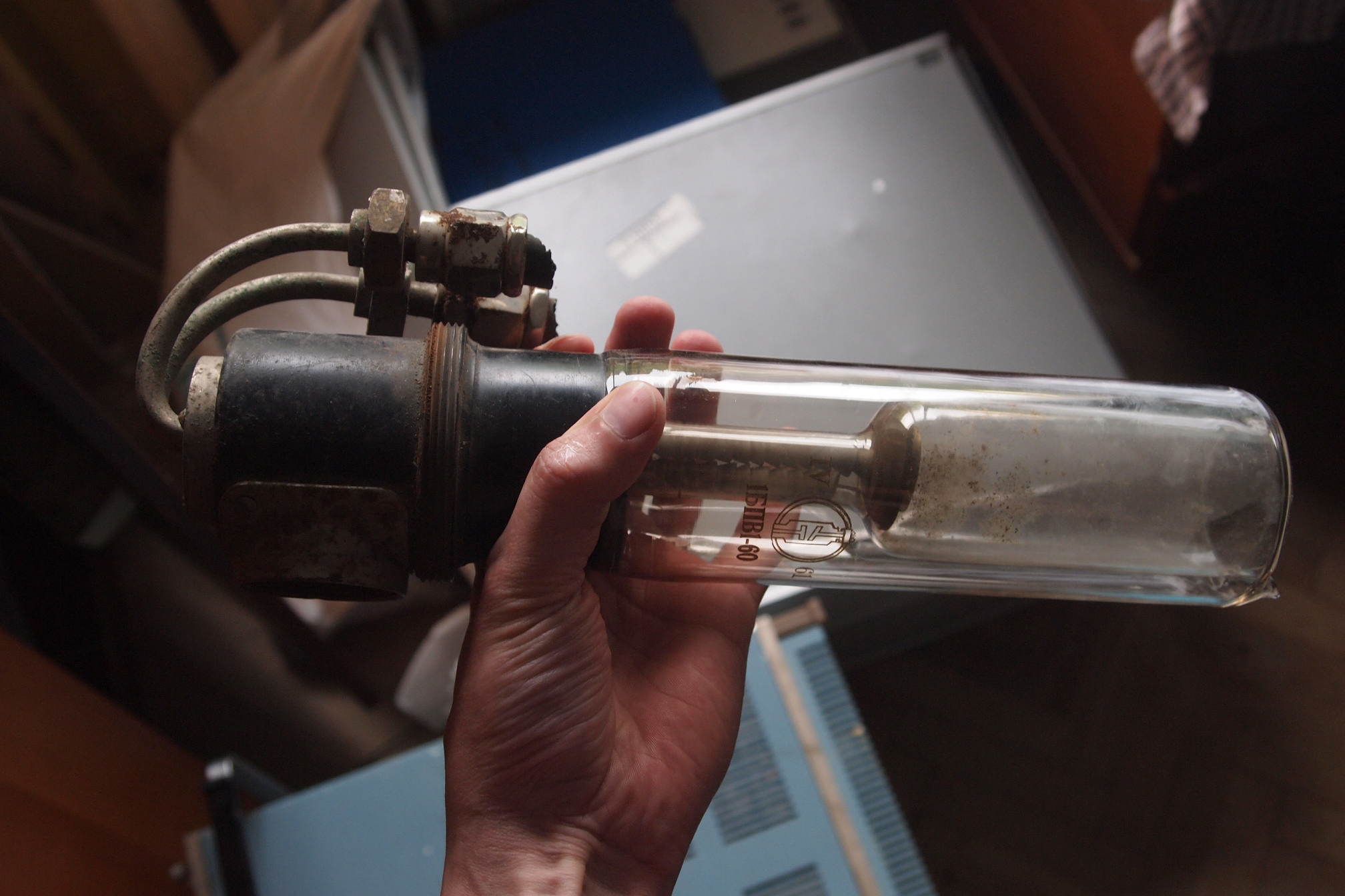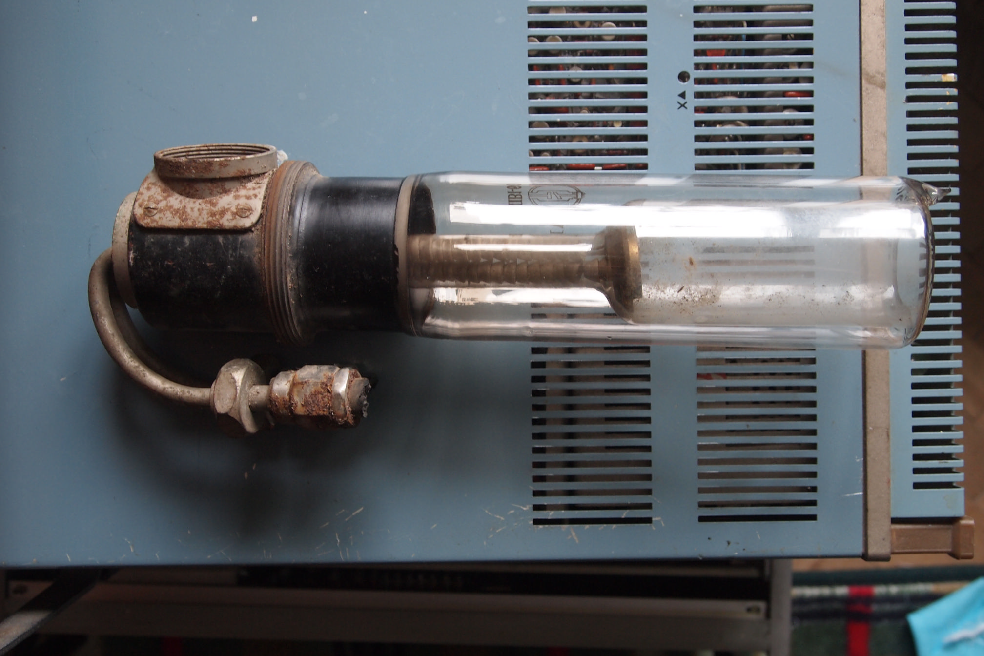 Работала, работала лампа гми-5 в генераторе управления тиратроном да в один прекрасный день насосала. Оказалось — в толще стекла цокольной части по непонятным причинам образовалась трещина, хотя лампа стояла в штатной панельке и ногами её никто не пинал. Прежде чем отправить в утиль, (0.85 г рыжего в сетках все же) решил сделать фотки на память. Лампа примечательна тем что фактически является уменьшенной копией лампы ГМИ7.
