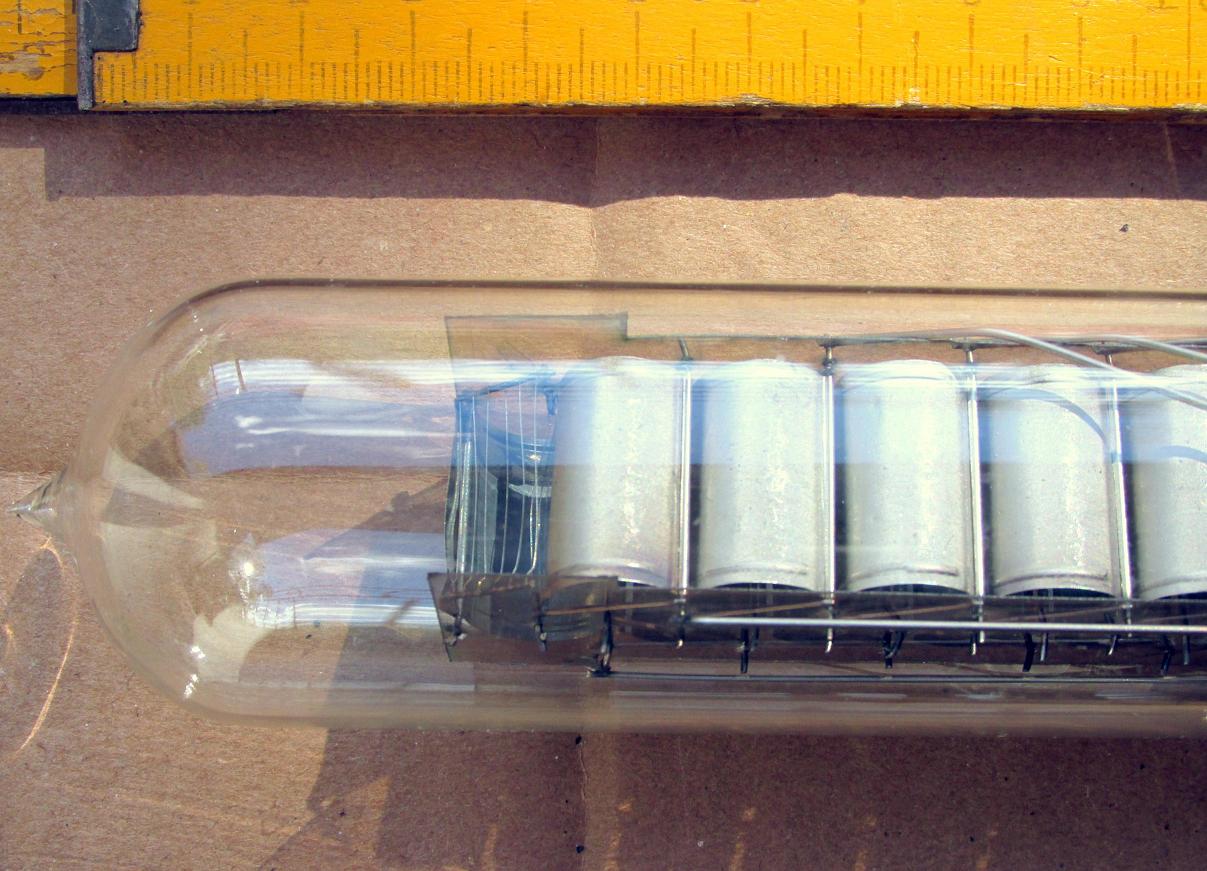Конструктивно это стеклянный баллон с пальчиковую лампу размером, из него торчат проволочные выводы, а внутри, на слюдяной подставочке, ампула с несколькими кольцевыми электродами. Нижняя половина ампулы чёрная, в одном месте на ней видны полосочки. Верхняя - прозрачная.