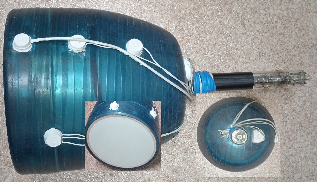 Тут мы видим прибор в готовом виде -- на его баллон нанесен внешний графитовый экран, который имеет контакт с выводом катода, ну и распаянный штатный делитель, причём для импульсного режима, так как в нем есть конденсатлры(оранжевые трубчатые элементы).