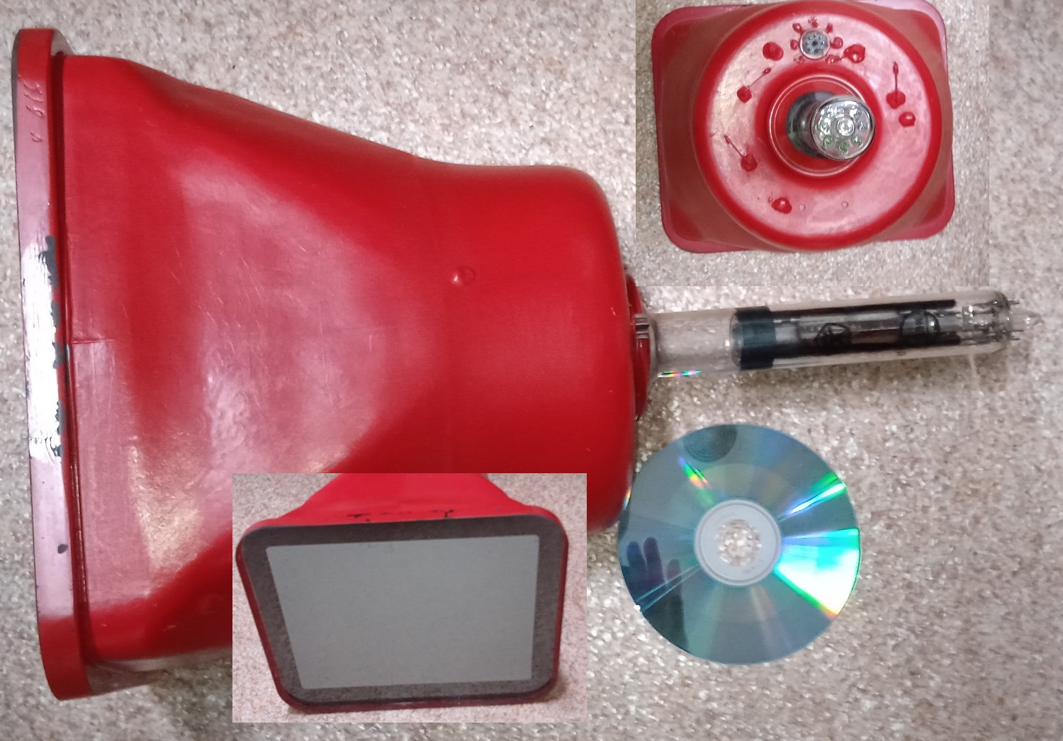 На верхних врезках показаны светофильтры. Заметен характерный для интереференционных светофильтров эффект: они пропускают один цвет, а отражают другой. Так же хорошо заметны выводы прожектора: кольцевой вывод модулятора, и два вывода (один обломан под корень) прямонакального прожектора. Сам тубус прожектора сделан из керамики.