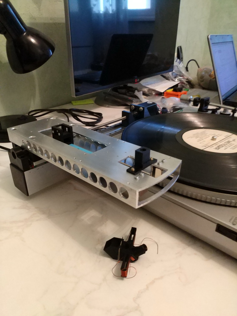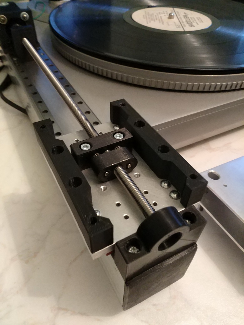 Приветствую Роман вас и всех, кто интересуется темой и в меру своих сил помогает! Вы как будто чувствовали мои намерения :), я буквально на этой неделе уже планировал написать здесь. Я никуда не пропал, все также занимаюсь проектом. К сожалению все получается долго по разным причинам - от банальной нехватки времени и заканчивая постоянным решением конструктивных проблем. Вижу уже сам, что я поставил слишком высокие требования к уровню исполнения конструкции и это очень ограничило мой маневр. Начиная с того, что я захотел сделать всю конструкцию очень компактной, в виде одного моноблока прикручиваемого к "любому" проигрывателю-донору, и вписать Блок Питания и электронику управления в размеры основания конструкции - квадратную алюминиевую трубу сечением 40 х 40 мм длиной 340 мм. Это было очень сложно и на это ушло много времени, пришлось даже платы делать этажеркой, чтобы все уместить. При этом я хотел сделать все модульным, как я писал об этом раньше, чтобы в случае каких-то изменений/переделок приходилось менять только какой-то модуль а не всю конструкцию сразу. Считаю, что мне это удалось, но опять же ценой многих часов которые были потрачены для тщательного продумывания всех мелочей. Из-за большой длины основания корпус для всей электроники пришлось конструктивно делать и печатать аж из трех частей, потому что у моего 3д принтера маленькое рабочее поле. Много раз корпус печатался фрагментами, чтобы уточнить все соединения и размеры. Немного переделал узел крепления ходового винта с подшипниками для упрощения его снятия/установки. Некоторые фотографии выложу здесь позже.