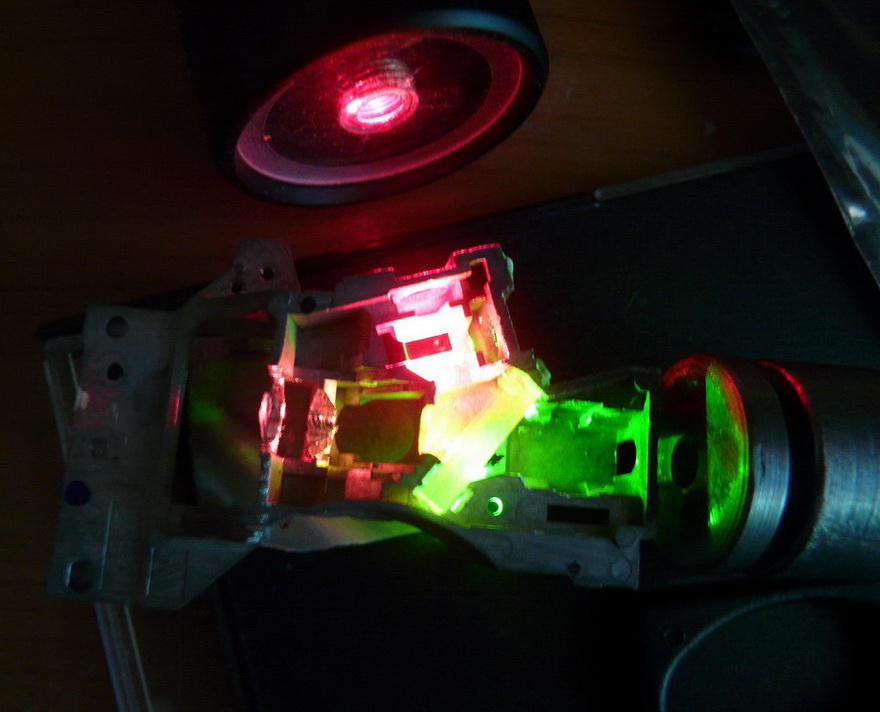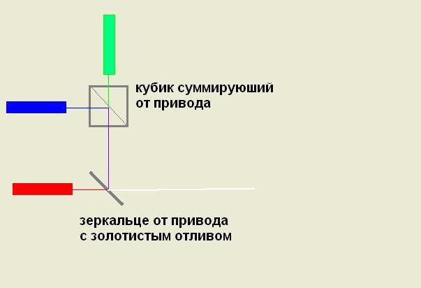 перепробывал все кубики, зеркальца и т.д., затем поменял кубик и зеркальце в головке подходящей. остановился так, кубиком объединил красный с зелёным, а потом зеркальцем с синим. только всё ровно и чётко еще не настраивал, поэтому выходной луч получился как бы не белый а разноцветный какойто и его плохо видно еще, потому что светло в комнате. вечером еси чо выложу фото, если что получится вот пару: на первой фото красный и зелёный включены, красный сверху, зелёный справа, но фото не виден. на второй все 3 on