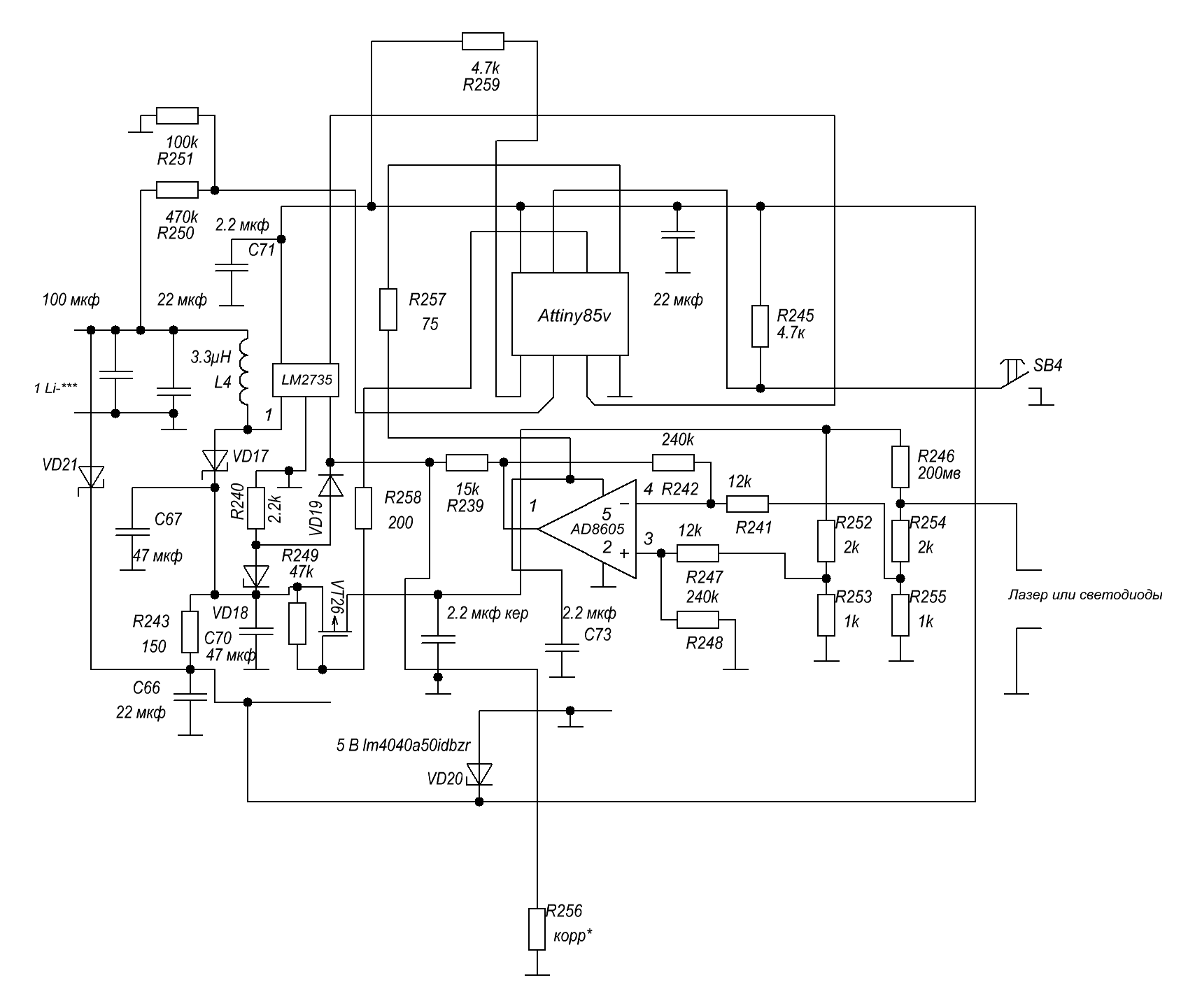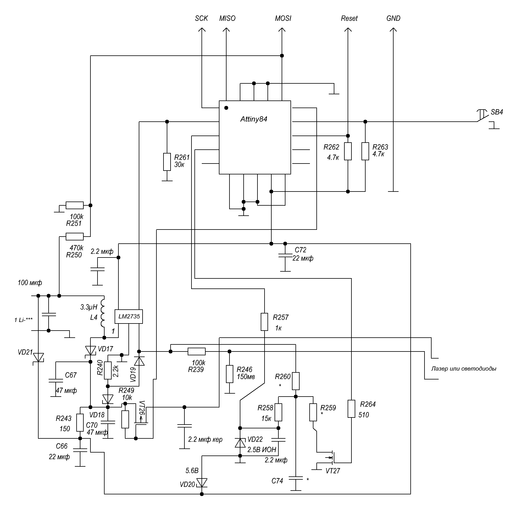 Вот решил выложить последние удачные драйвера в основном для 405 и 512нм ЛД в силу их высокой напруги где распространённые buck-boost неприменимы. Один драйвер 2 уровня мощности максимально простая схема нагрузка подвешена v2.1. Другой с общим - со всеми вытекающими v2.0 (я кончено стремлюсь к общему - путь это не популярно и усложняет схему) Пусть конечно тема драйверов на LM27** серии избита но не сильнее темы MC34063. В добавок эти драйвера могут реально работать вплоть до 1В старт не ниже 2.4В, то есть полноценная работа от Lifepo4 и даже 2 Ni-**. Правда реальная работа ниже 2.1В небезопасна и потому работа на ней запрещена, для низких мощностей можно разрешить но это будет убийство для АКБ один фиг. Стандарт 3 типа источников питания Li-Ion, Lifepo4, и по полной до 2.1В. При работе по полной не факт что после выключения не произойдёт перезагрузка МК из-за низкой напруги питания (но это абсолютно безопасно). В любом случае поправить напруги в прошивке думаю не у кого не составит труда на любые напруги и лимиты работы. Если захочется разрядить АКБ можно просто отключить спящий и потребление 5мА обеспечено до срабатывания супервизора питания. От этого режима мало практического применения но может и пригодится. Оно включается тоже в стартовом меню. Пара интересных моментов. LM2735 отказывается стартовать когда напруга на FB близко к лимиту пришлось делать старт всегда на максе через 30мс моща устанавливается в соответствии с выбранной, всышку видно на глаз, плавность тока через ЛД составляется 10мс что полностью исключает опасные выбросы. LM3410 её аналог как бы стаб тока без плавного старта плюёт импульсом приемлемо лишь для СИД. Переключение мощность есть во всех драйверах где нет переключения мощности реального пониженная мощность обеспечивается просто при выключенном преобразователе (тут конечно нет не какого старта на полной мощности и стабильности на миниме тоже нет). В любом случае запретить переключение мощности делается из стартового меню. По поводу TSP63020 которая была бы хороша для всех остальных ЛД есть малость НО! Проблема состоит с монтажом при 2-х сторонней разводке в прошлой версии она располагалось над МК что приводило к перезагрузке МК планирую след драйвер буду пробовать но однозначно у него будет плохо с охлаждением и время работы будет сильно урезано до 20сек. В фонарике с 2-х платным драйвером она прописалась на 125%. Схемы с использованием LM3488 решил не показывать как они всем кажутся слишком осложняемыми хотя моща как раз для синих. В силу реальных обстоятельств как всегда элементы которые ставились подбором в схеме не прописаны, если уж кому будет надо то погляжу и пропишу. Думаю решусь на 2-х платны драйвер под корпус Эра SB1 в таком случае будет много уровней мощности с программной регулировкой мощности уже на TPS63020 обязательно выложу, но планировать буду только с общим - как драйвер будет 1-5.5В от ИК до синих, красные потребут общего -, а ИК я изолирую от корпуса модуль. А архивах полные проекты может кому то сгодится.